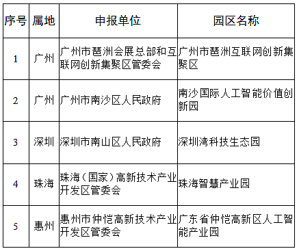 为贯彻《广东省加快发展新一代人工智能产业实施方案(2018-2020年)》,加快我省人工智能产业集聚发展,推动人工智能与实体经济深度融合,根据《广东省经济和信息化委办公室关于开展人工智能产业园区申报工作的通知》(粤经信办函〔2018〕328号)要求,我厅组织开展了全省首批人工智能产业园区申报工作,经各地市工业和信息化主管部门推荐、专家评审实地考察和网上公示,现予以公布。